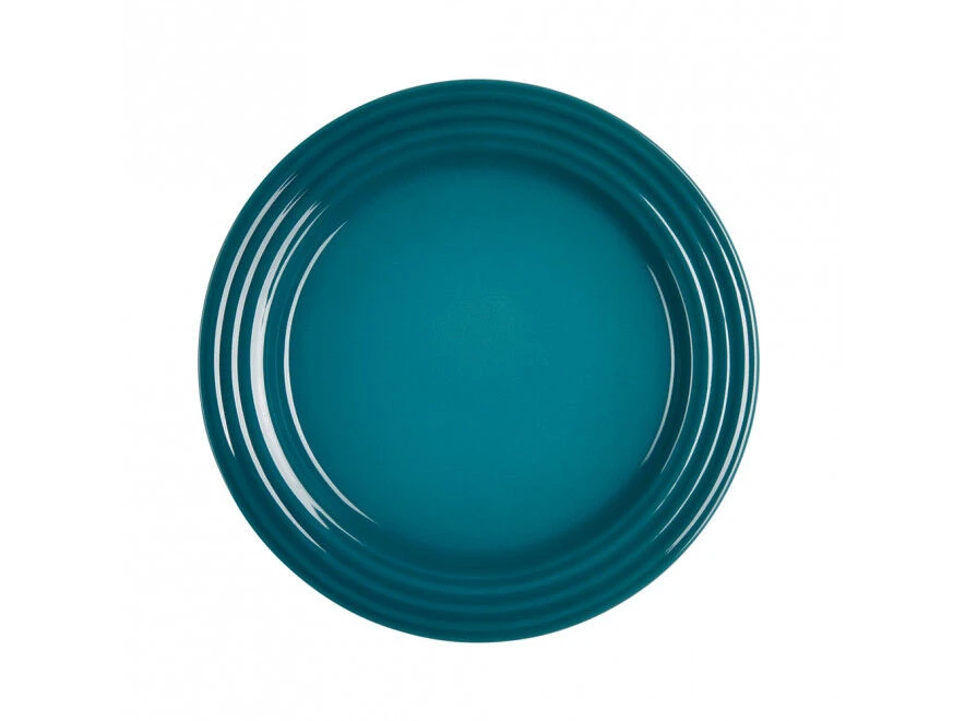 Het dessertbord van Le Creuset is gemaakt van geglazuurd aardewerk, uitgevoerd in donker groenblauw, en heeft een glanzende afwerking. Het bord heeft een diameter van 22 cm.