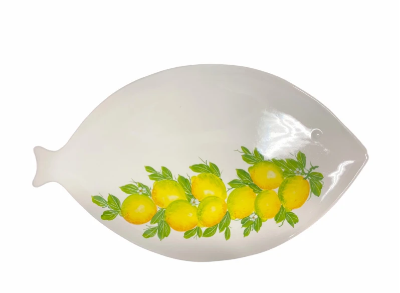 De Oldenhof citroen presenteerschaal is gemaakt van aardewerk in de vorm van een vis met versiersels van citroenen. De schaal is wit en heeft een lengte van 33 cm met een breedte van 19 cm. Gebruik de schaal voor het opdienen van vis of andere gerechten.