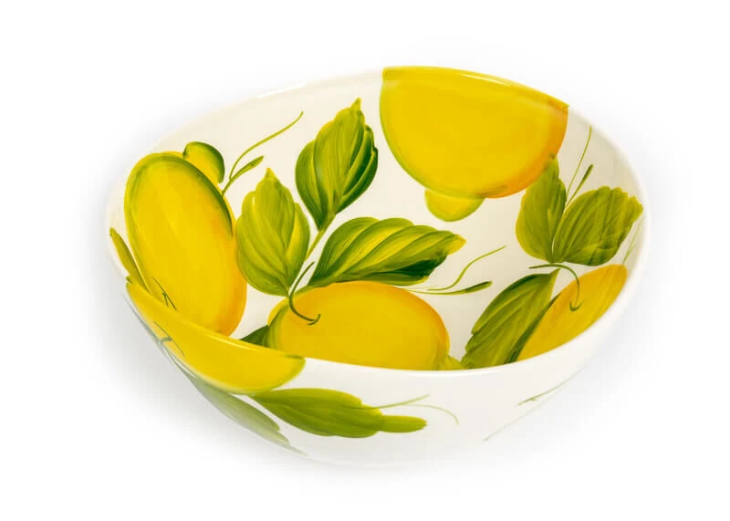 De organische Oldenhof schaal is gemaakt van wit aardewerk en is gedecoreerd met citroenen en bladeren. De diameter van de schaal is 25 cm en de hoogte is 10 cm. Gebruik de presenteerschaal voor salades of andere zomerse gerechten.