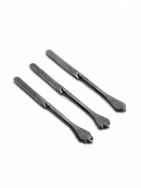 De Serax Merci Mix 1-2-3 antraciet grijze dessertmessen zijn gemaakt van roestvrij staal dat een stonewash-behandeling heeft gehad. Elk van de drie delen heeft een ander einde van de handgreep. Dek het mes in voor het nagerecht.