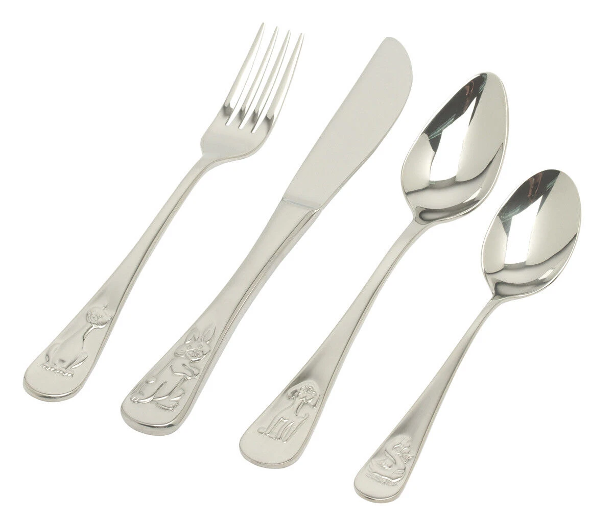 Met het Van Kempen & Begeer Junior kinderbestek eten ook de jongste eters met plezier mee. De bestekdelen zijn voorzien van vrolijke afbeeldingen. Het bestek is vervaardigd uit hoogwaardig roestvrij staal dat goed bestand is tegen voedselzuren. Het formaat van onderdelen van het bestek zijn goed afgestemd op de kinderhand en -mond. Het mes heeft een afgeronde bovenzijde waarmee niet ‘gestoken’ kan worden. Tevens is het mes botter waardoor het veiliger is in gebruik door kinderen.