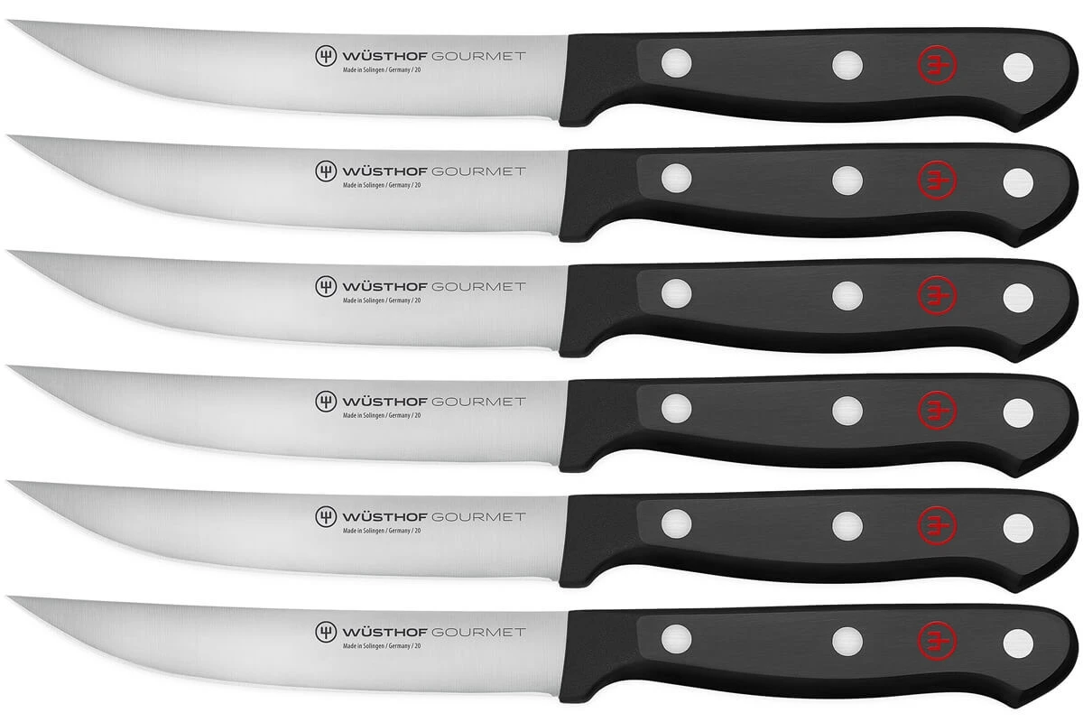 De steakmessenset bestaat uit 6 Wüsthof Gourmet steakmessen. Deze messen zijn vervaardigd uit messenstaal, dat roestbestendig is en lang scherp blijft. U gebruikt het steakmes voor het snijden van vlees aan tafel.